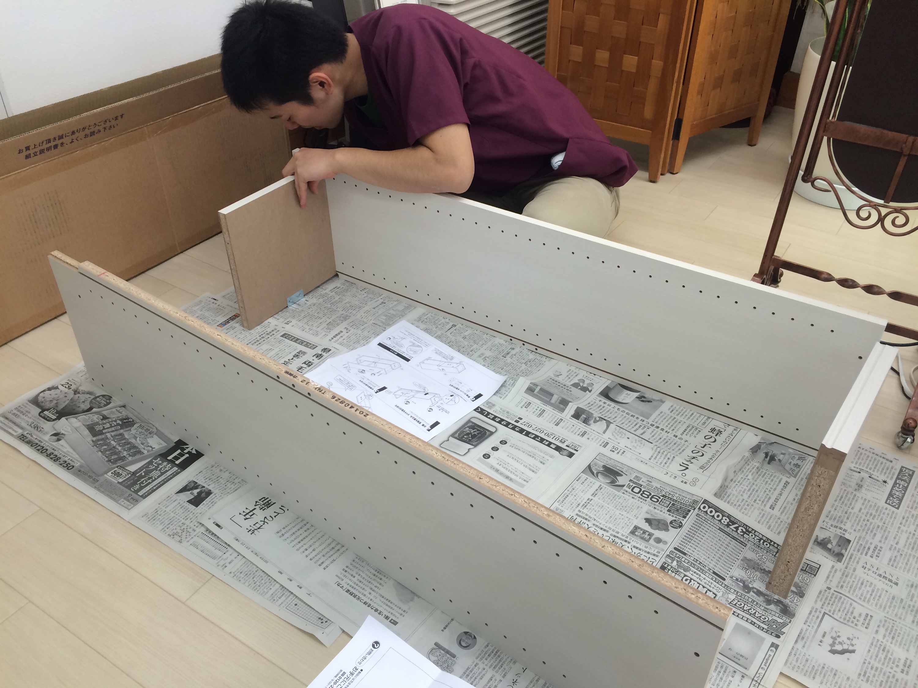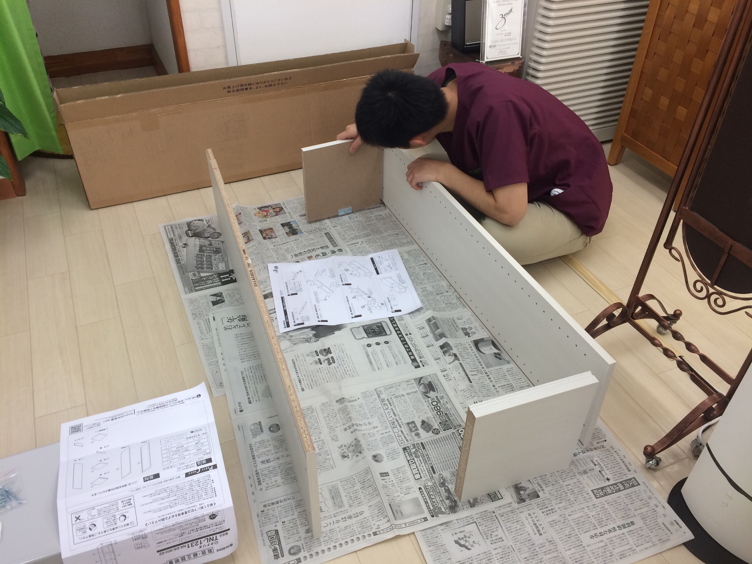 受注生産の棚でしたが、先日ようやく届いたので、昼休みに勇作が組み立て始めました